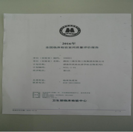 2016年10月13日,我酶免產(chǎn)品HBsAg、HBsAb、HBeAg、HBeAb、HBcAg、抗-HCV全部以滿(mǎn)分成績(jì)通過(guò)衛生部臨檢中心感染性疾病血清學(xué)標志物系列A第3次室間質(zhì)評。