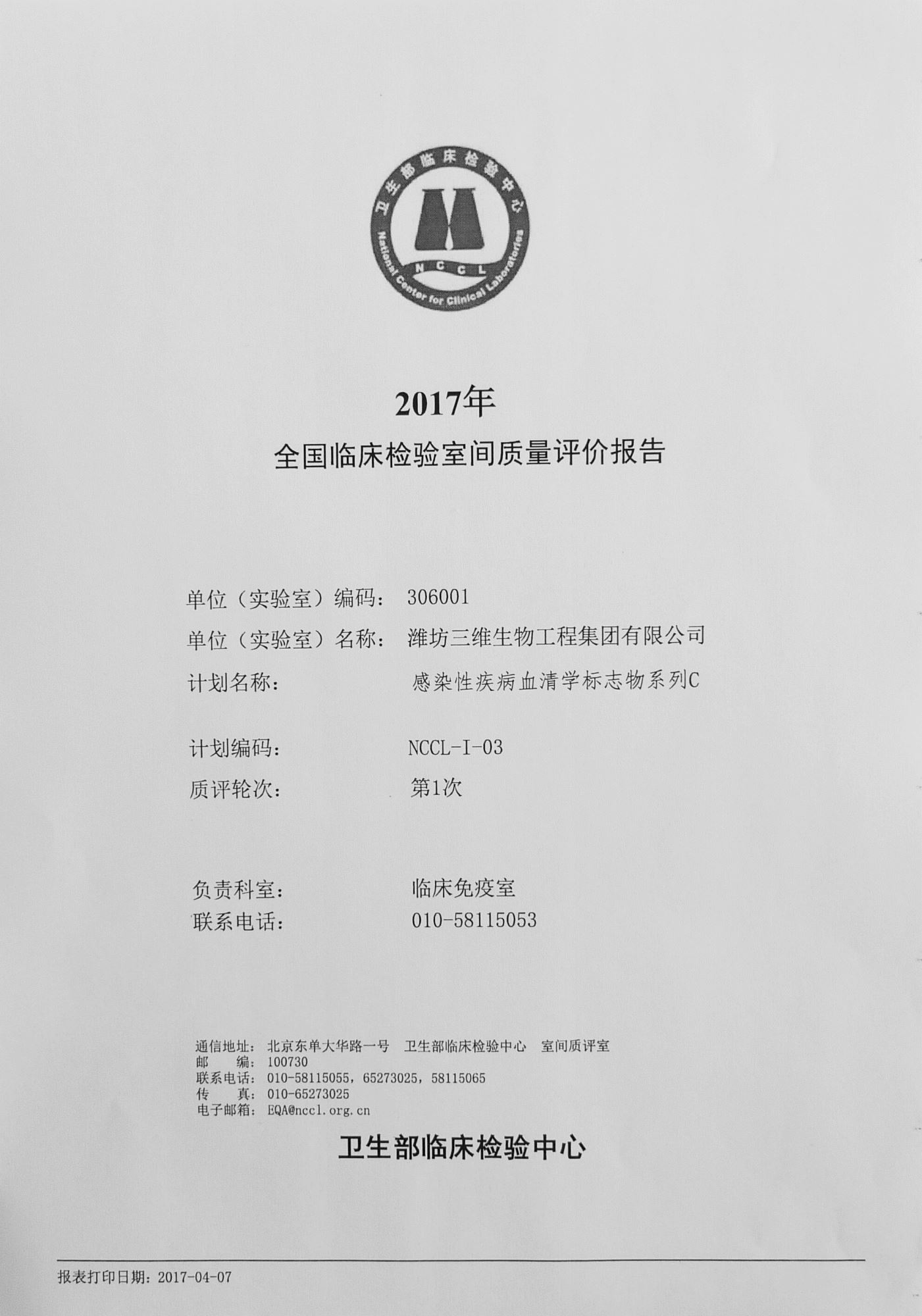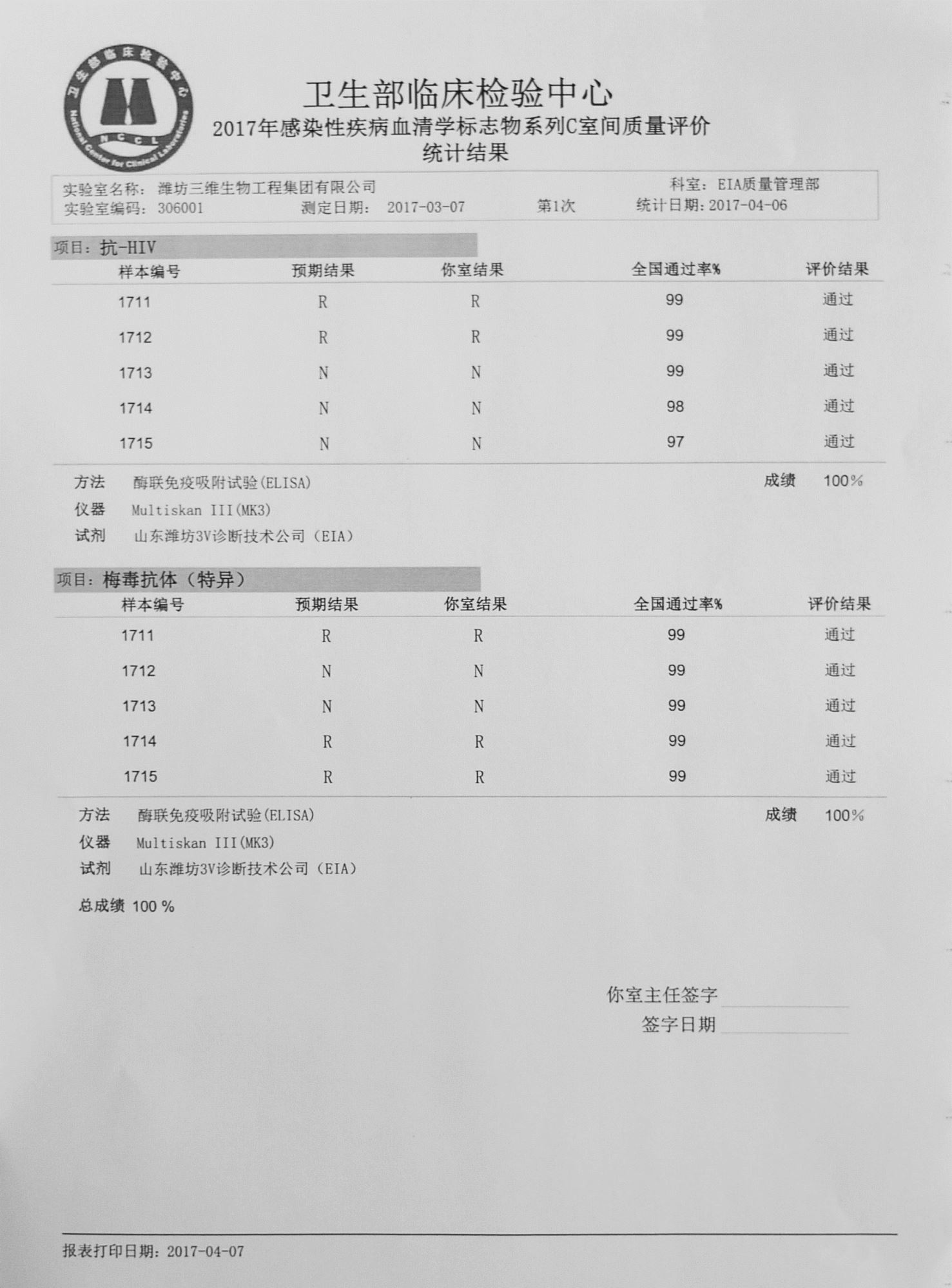 2017年4月7日,我公司感染性疾病血清學(xué)標志物系列C產(chǎn)品抗-HIV、梅毒抗體(特異)全部以滿(mǎn)分成績(jì)通過(guò)衛生部臨檢中心第1次室間質(zhì)評。