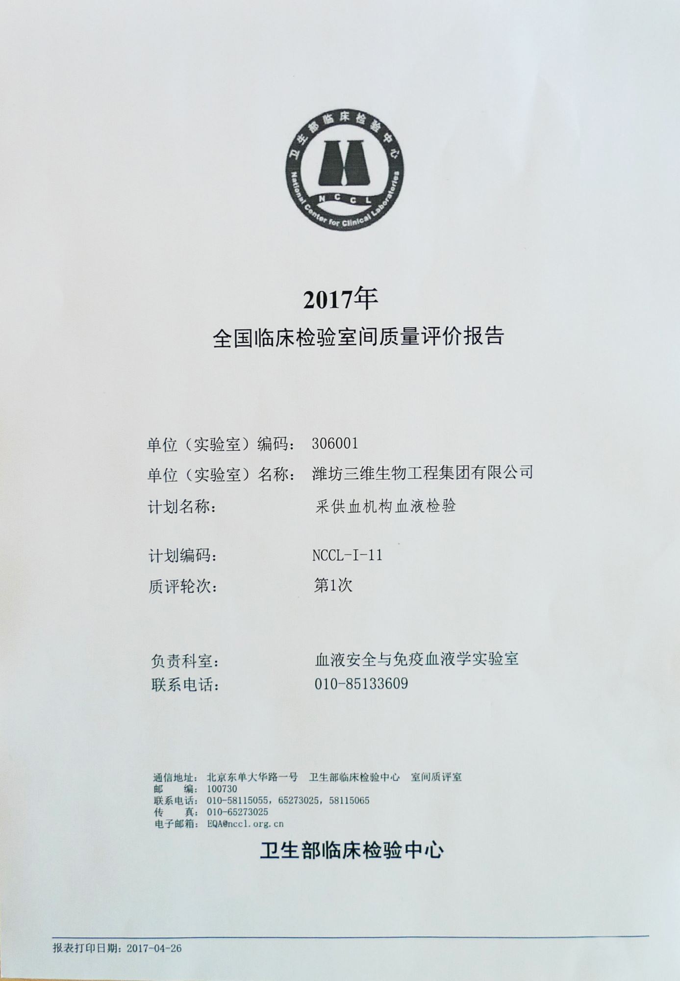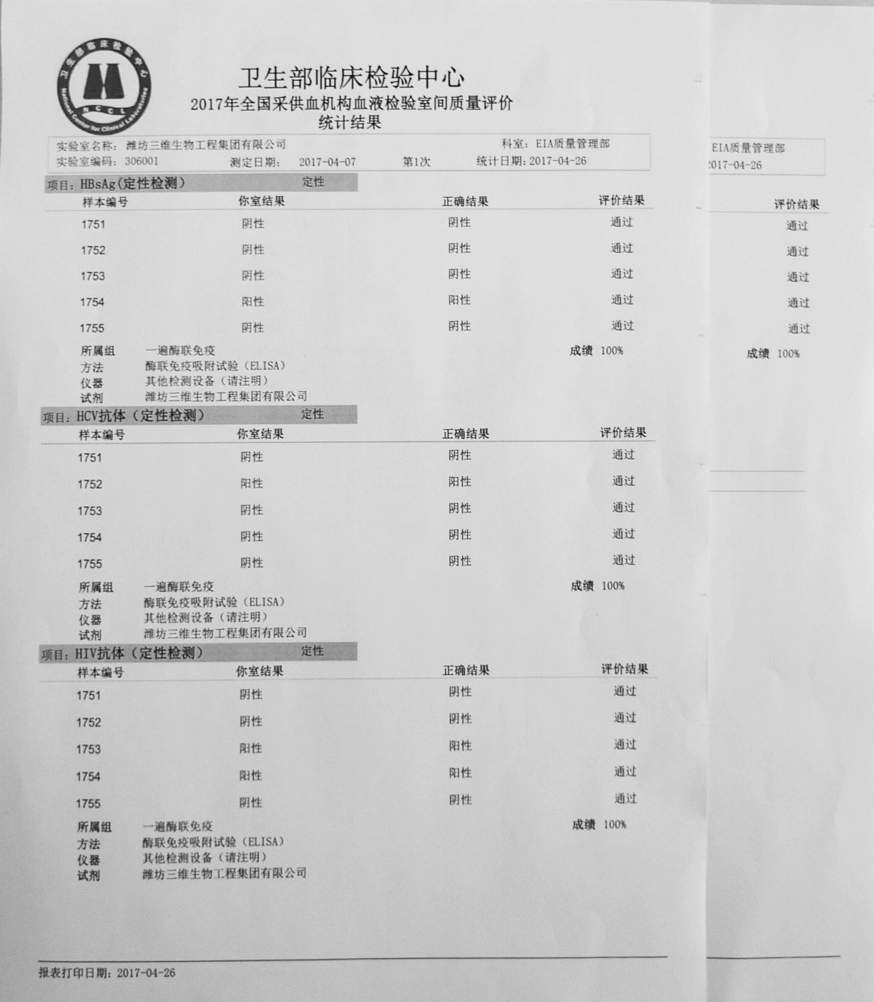 2017年4月26日,我公司采供血機構血液檢驗產(chǎn)品HBsAg、抗-HCV、抗-HIV(1+2)、抗-TP全部以滿(mǎn)分成績(jì)通過(guò)衛生部臨檢中心第1次室間質(zhì)評。