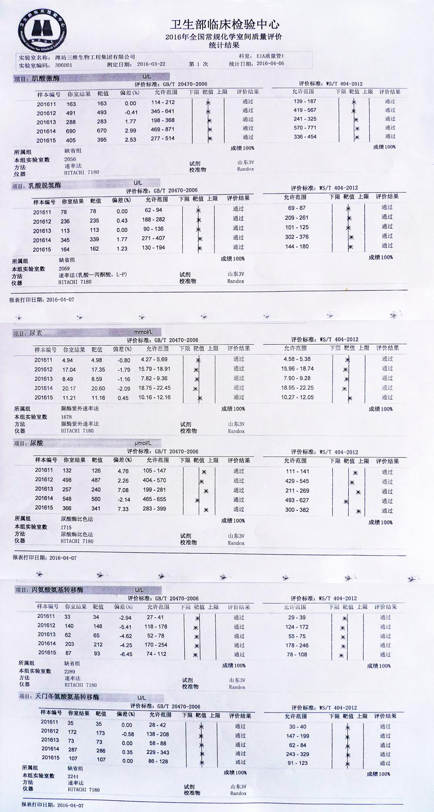 3V生化試劑盒在衛生部臨檢中心2016年第1次室間質(zhì)評中取得滿(mǎn)分成績(jì)