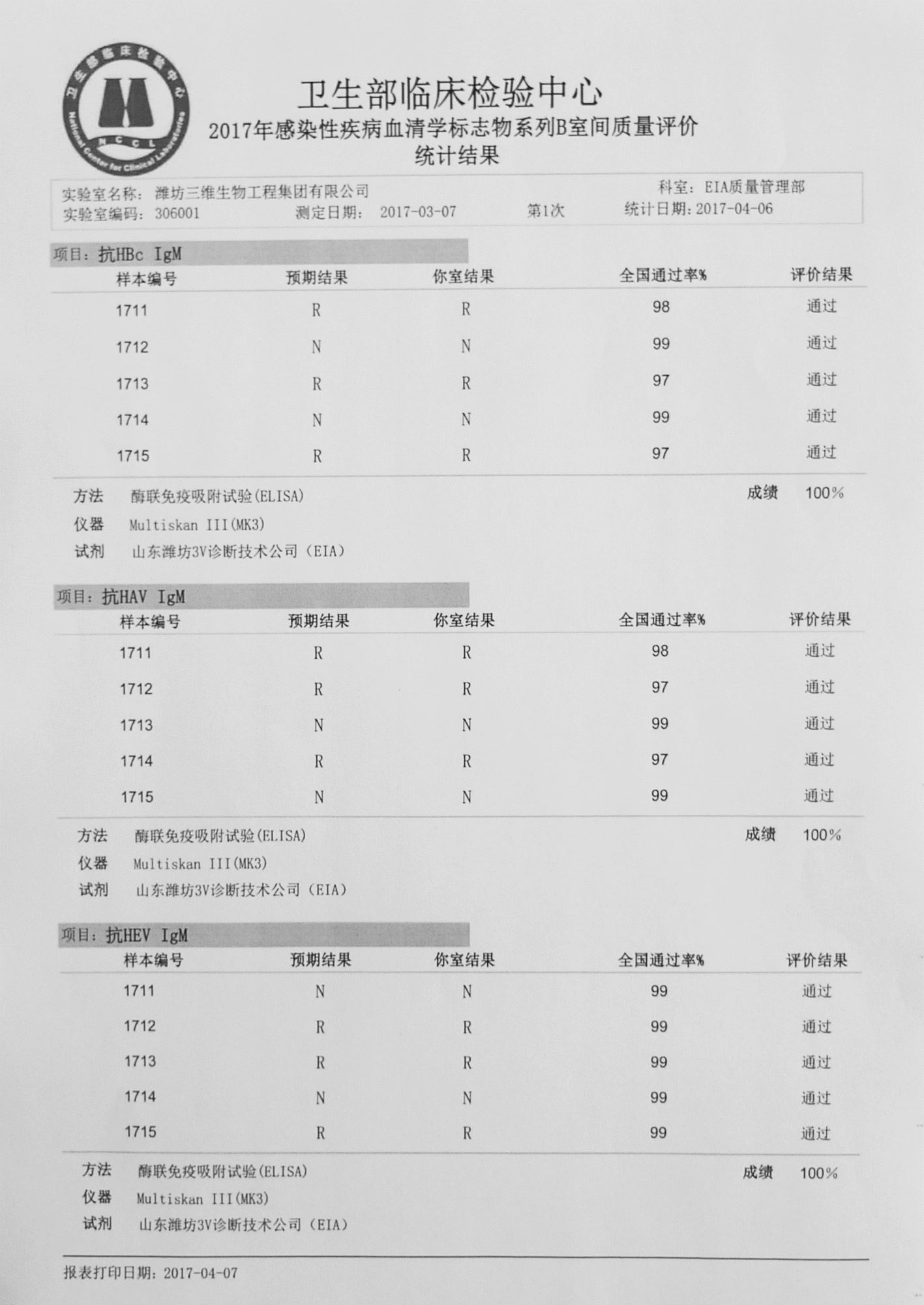 2017年4月7日,我公司感染性疾病血清學(xué)標志物系列B產(chǎn)品抗-HBc IgM、抗-HAV IgM、抗-HEV IgM全部以滿(mǎn)分成績(jì)通過(guò)衛生部臨檢中心第1次室間質(zhì)評。