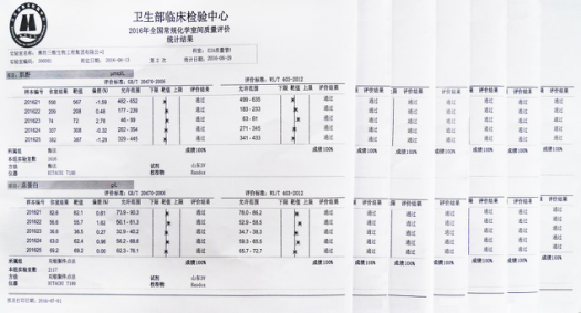 我公司每年都參加衛生部臨檢中心的室間質(zhì)評。2016年7月1日又傳捷報, 我公司常規化學(xué)產(chǎn)品鈣、磷、鎂、鐵、血糖、尿素、尿酸、肌酐、總蛋白、白蛋白、總膽固醇、甘油三酯、丙氨酸氨基轉移酶、天門(mén)冬氨酸氨基轉移酶、淀粉酶、肌酸激酶、乳酸脫氫酶、γ-谷氨?;D移酶、α-羥丁酸脫氫酶、膽堿酯酶、直接膽紅素全部以滿(mǎn)分成績(jì)通過(guò)衛生部臨檢中心第2次室間質(zhì)評。