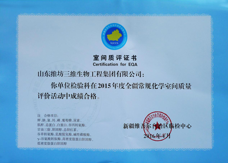 我公司生化試劑盒鉀、鈉、氯、鈣、磷、葡萄糖、尿素、肌酐、總蛋白、白蛋白、谷丙轉氨酶、甘油三酯、膽固醇、總膽紅素、谷草轉氨酶、乳酸脫氫酶、堿性磷酸酶、γ-谷氨酰轉肽酶、高密度脂蛋白膽固醇、低密度脂蛋白膽固醇在2015年度全疆常規化學(xué)室間質(zhì)量評價(jià)活動(dòng)中成績(jì)100%合格。并與2016年5月20日取得證書(shū)。